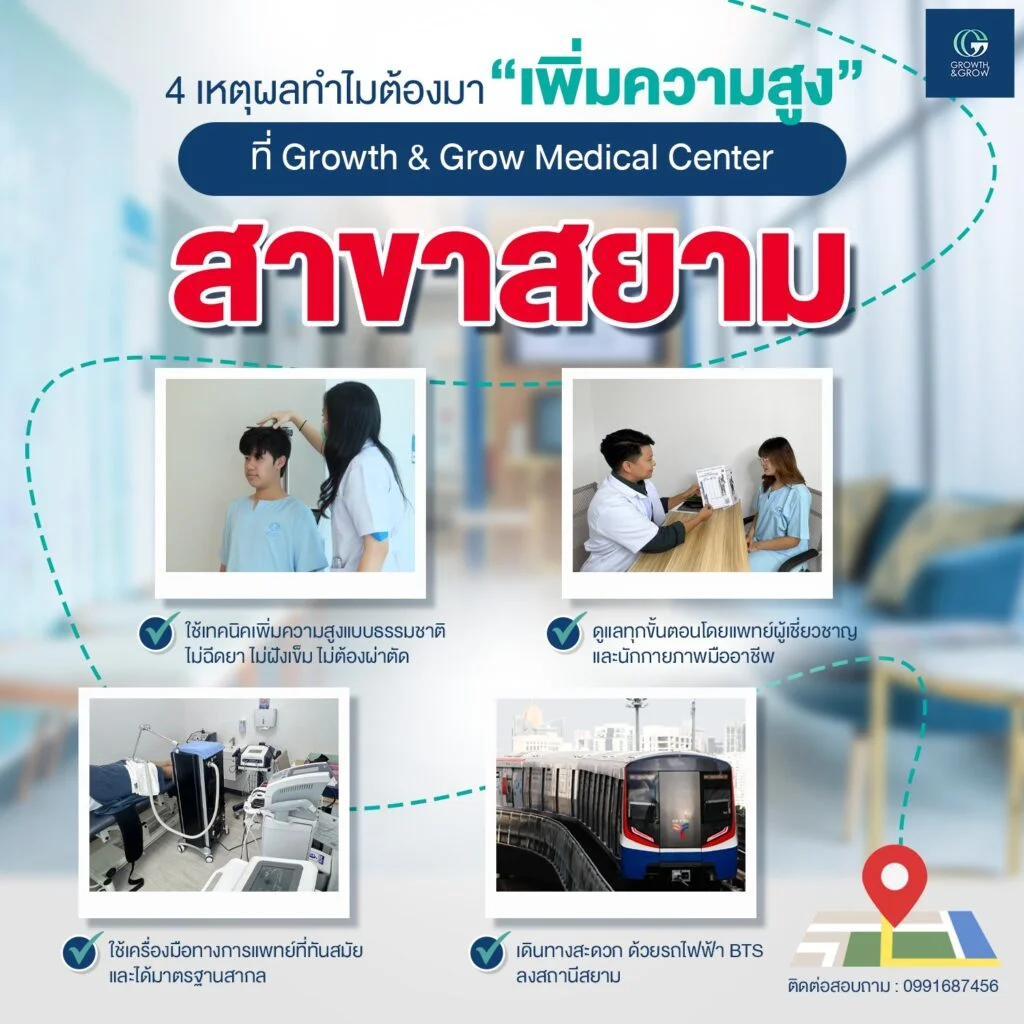 ติดต่อ Growth & Grow Medical Center คลินิกเพิ่มความสูง ของเราเพื่อปรึกษาแพทย์เรื่องความสูงได้แล้ววันนี้ เพื่อเริ่มต้นการเปลี่ยนแปลงให้กับท่าน และท่านจะได้เห็นว่าการเพิ่มความสูงนั้นไม่ใช่เรื่องที่ยากอีกต่อไป